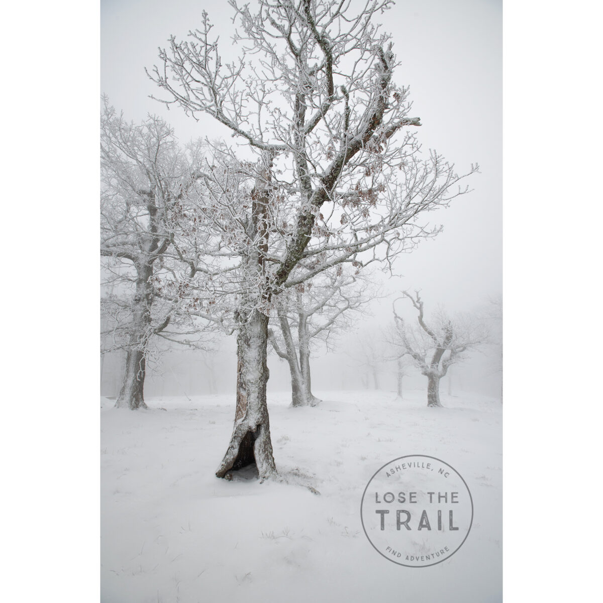 A hollowed weathered tree on a snowy mountain top in Western North Carolina.